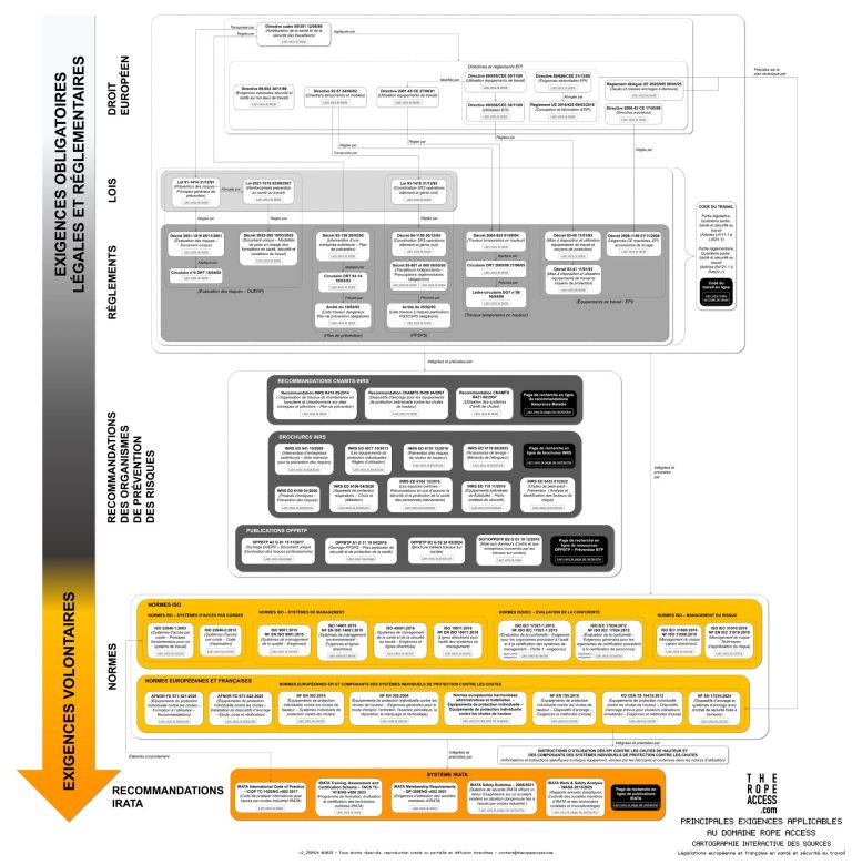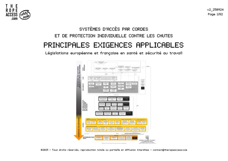 Les principales exigences en matière de santé et sécurité au travail appliquées au domaine des systèmes d'accès par cordes et de protection individuelle contre les chutes, présentées hiérarchiquement sur une seule page, accompagnées des liens directs vers les documents sources.